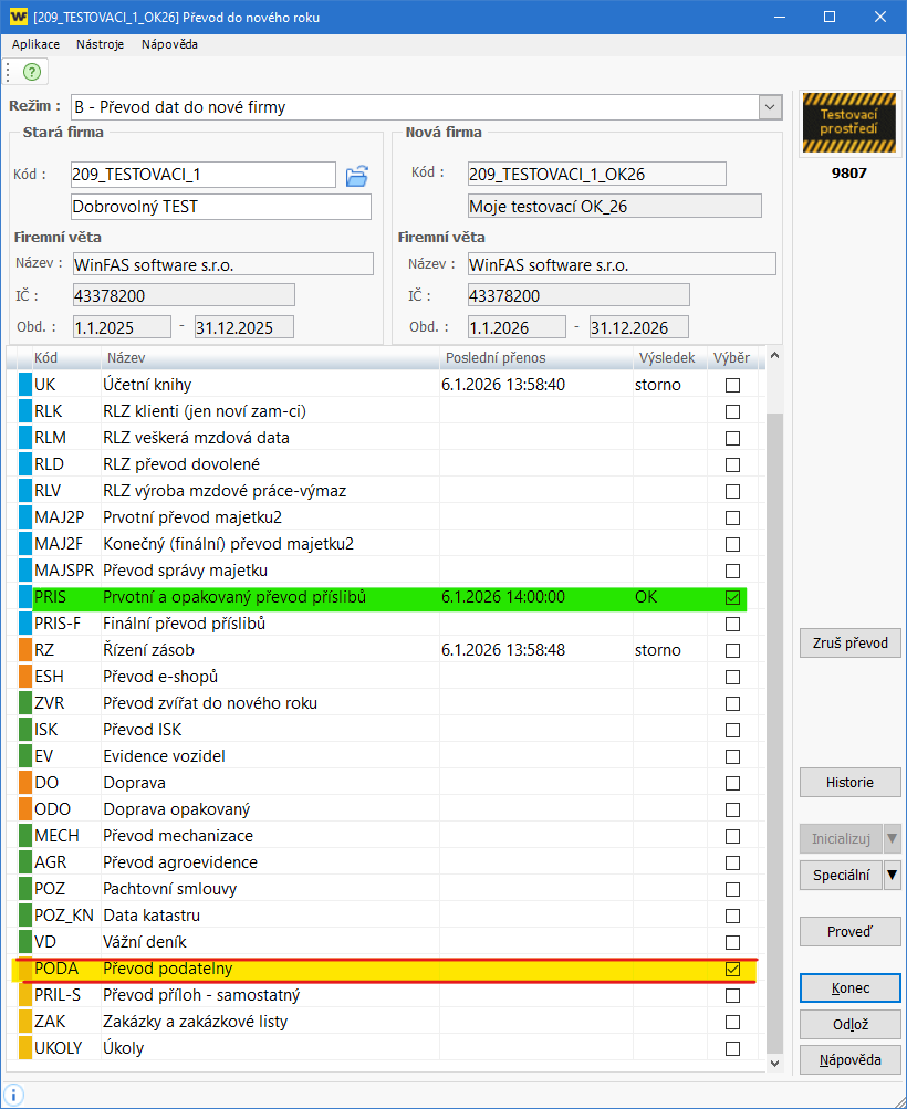 - Při opakovaném převodu zaškrtněte prosím v *9807 možnost převodu PODA - Převod podatelny.