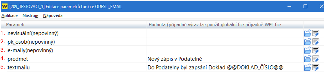 - Otevře se okno Editace parametrů funkce ODESLI_EMAIL