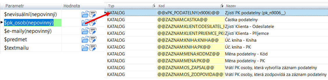 - 1. příklad - při zápisu dokladů v Podatelně je uživatelem vyplněna osoba zodpovědná za zápis. Do pole pk_osob vyberete z katalogu proměnných fuknci @@ZAZNAM:OS_ZODPOVIDA@@, která automaticky dohledá osobu zodpovědnou za zápis a odešle jí email (pozn. za předpokladu, že je u osoby uveden email v číselníku *3004 - Osoby)