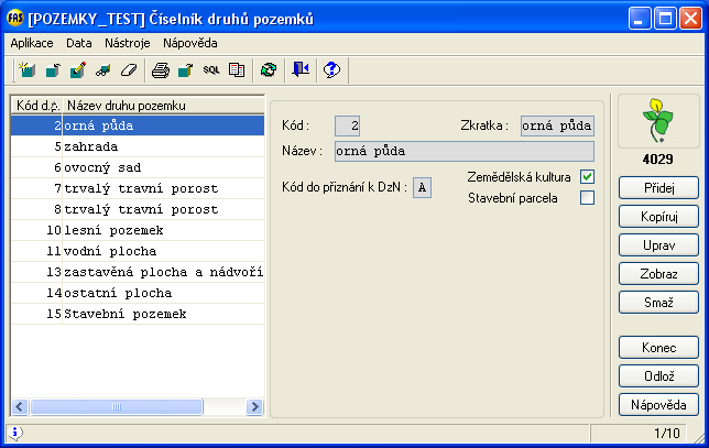 2) Číselník druhů pozemků *4029 - k jednotlivým druhům pozemku přiřadíme kód do přiznání z DzN z předešlého číselníku *4008.