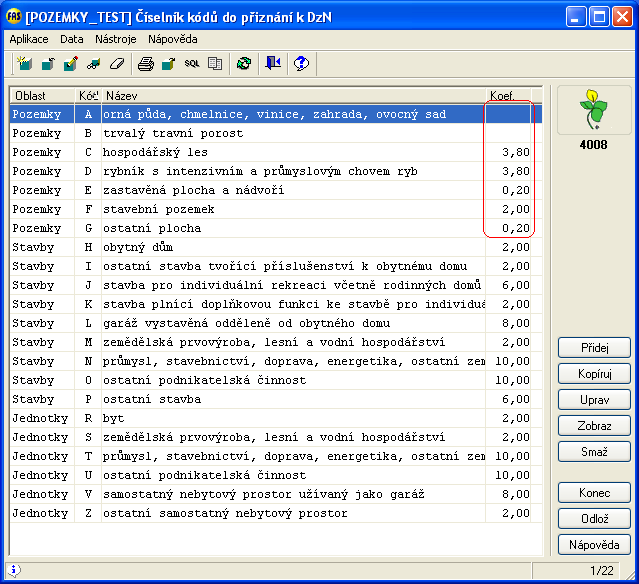 1) Číselník kódů do přiznání DzN *4008 - zkontrolovat a doplnit aktuální koeficienty.