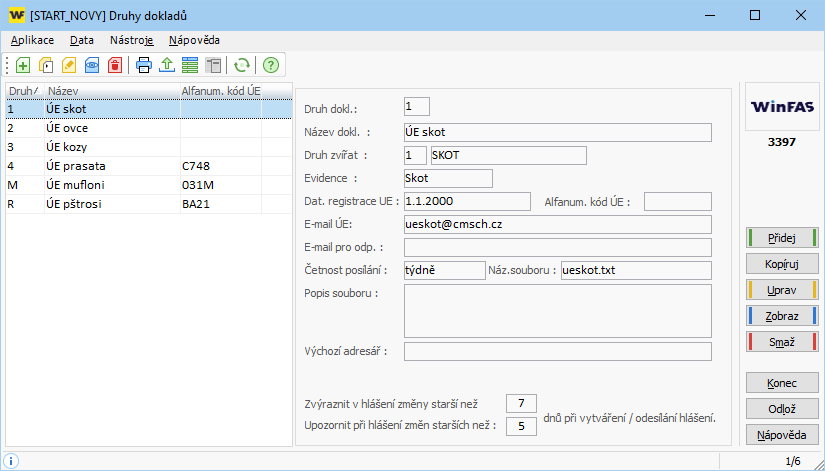 - Evidence: zvířata, pro která bude hlášení zasláno.