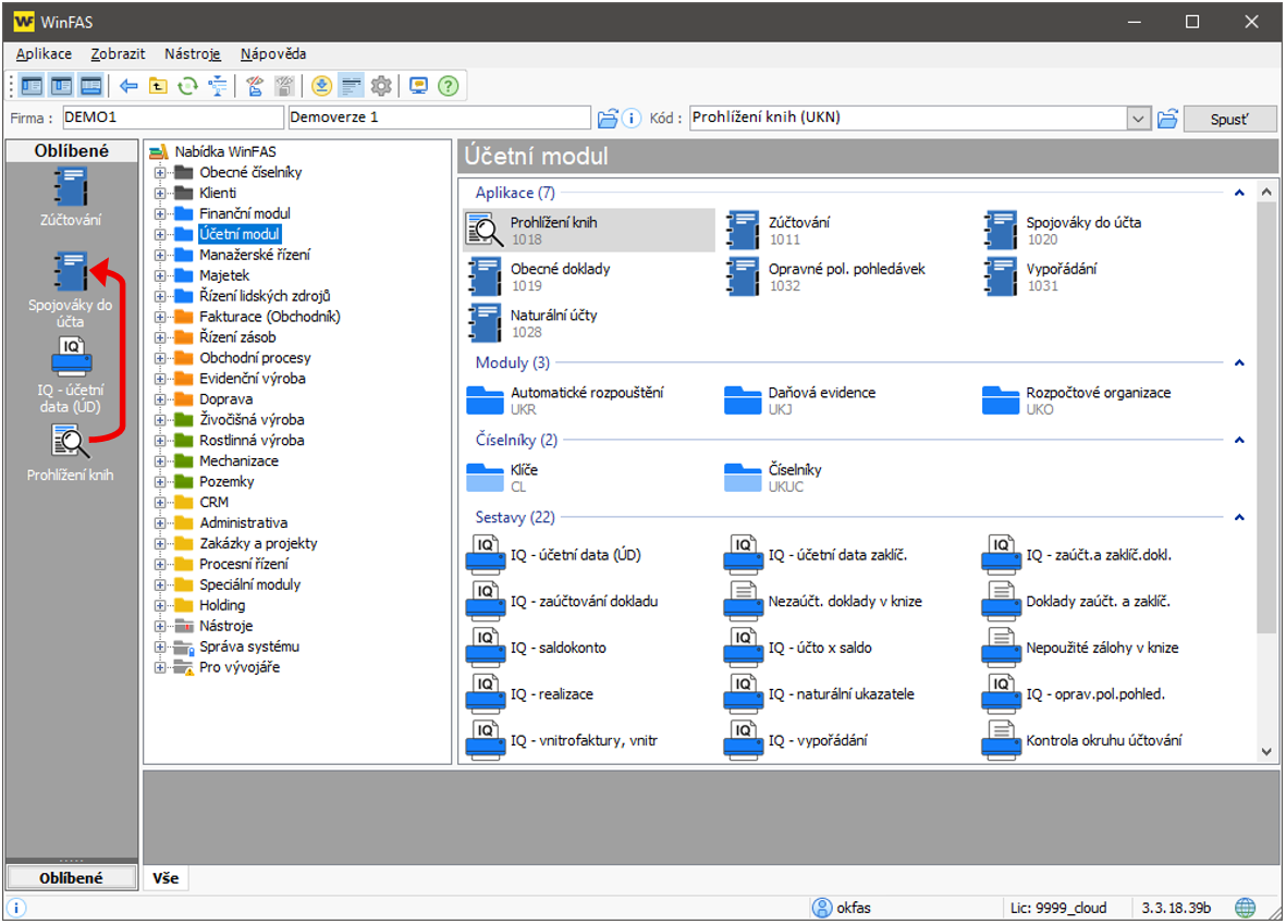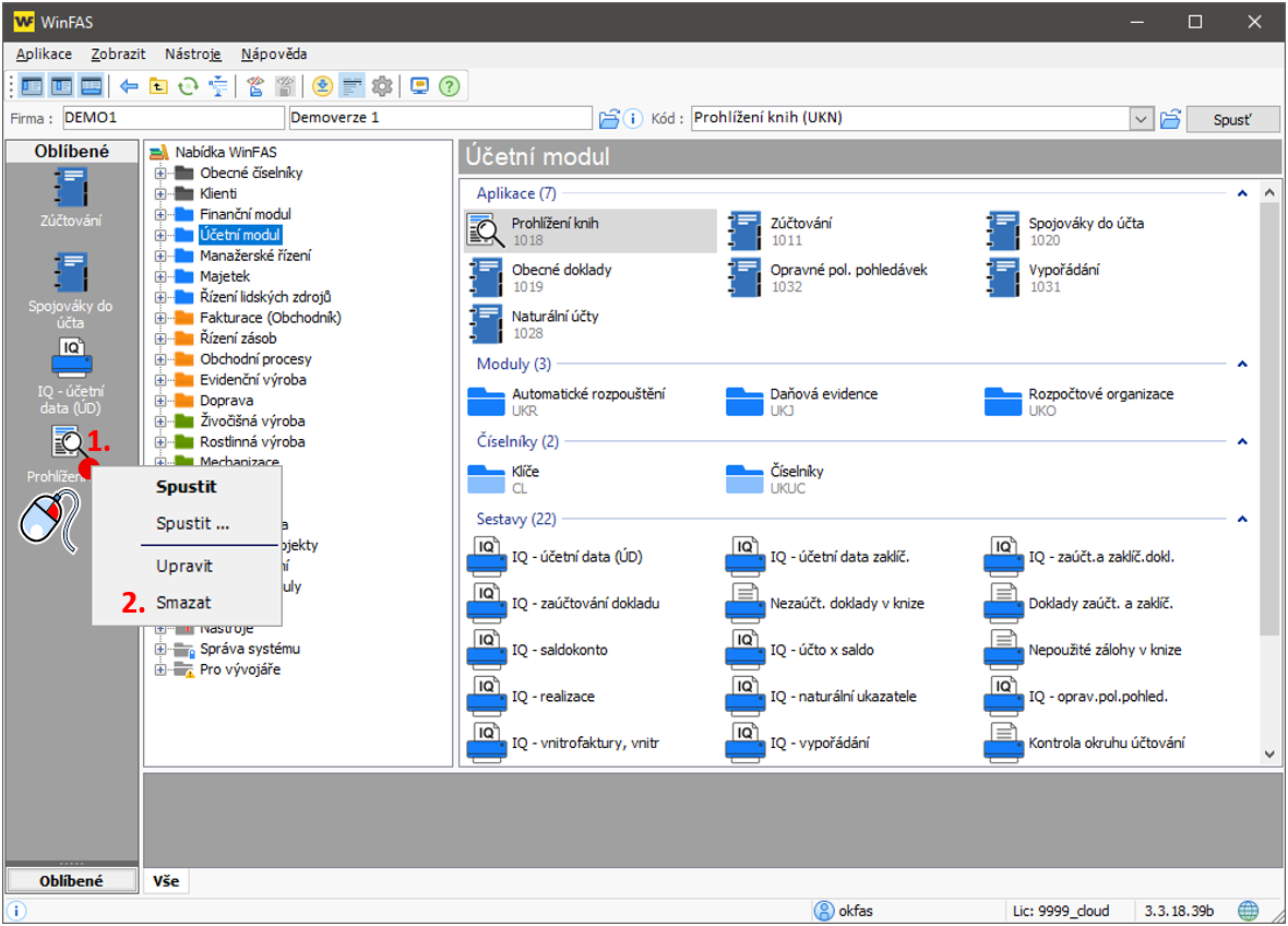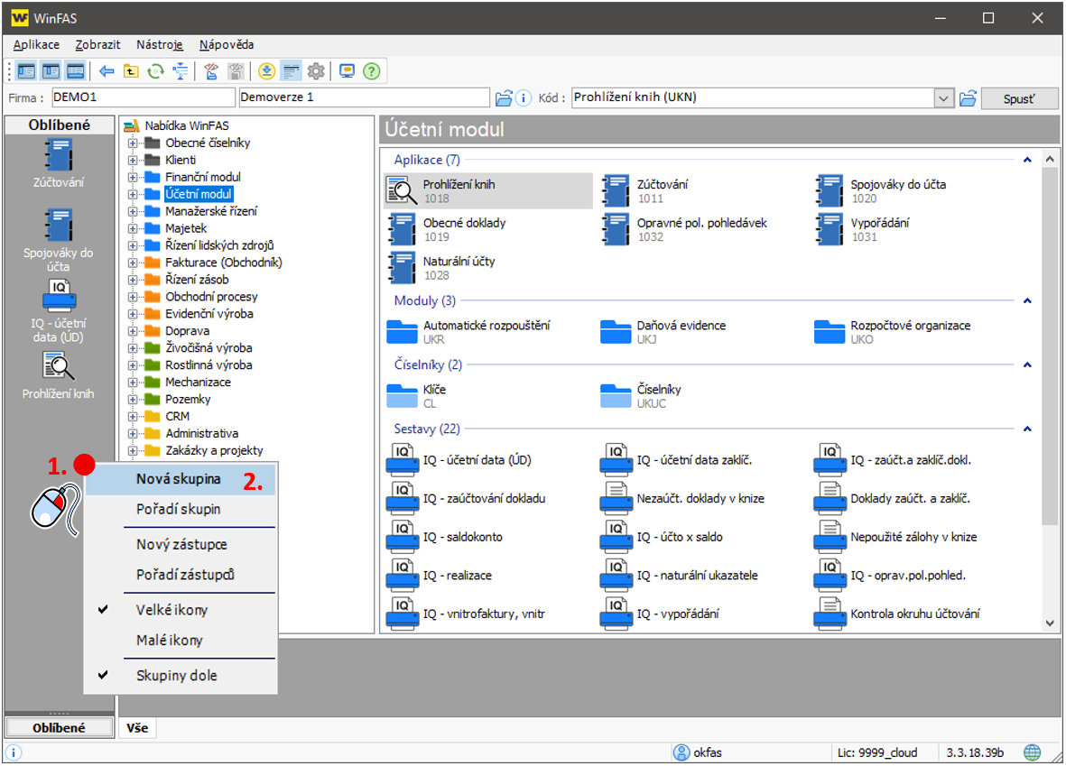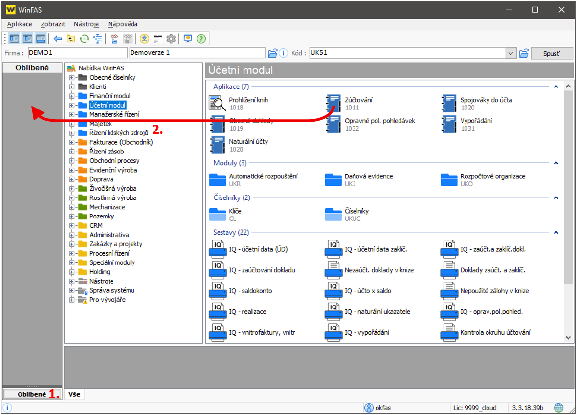 Přepněte se do Centrálního manažeru - úvodní okno WinFASu. V levé části okna vidíte sloupec určený pro oblíbené ikony. Ikony jsou rozděleny do skupin a ve výchozím nastavení je vždy založena skupina pojmenovaná Oblíbené. Pokud máte založeno více skupin oblíbených ikon, vyberte nejdříve tu, kterou chcete nyní naplnit (1.). V nadpisu levého sloupečku se objeví název vybrané skupiny. Nyní si v pravé části okna najděte ikonu, kterou chcete zařadit mezi oblíbené. Levým tlačítkem myši ikonu chyťte a přesuňte ji mezi oblíbené (2.). Uvolněte levé tlačítko myši. Opakováním kroku 2. můžete do stejné skupiny zařadit i další oblíbené ikony. Hotovo.