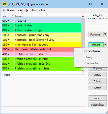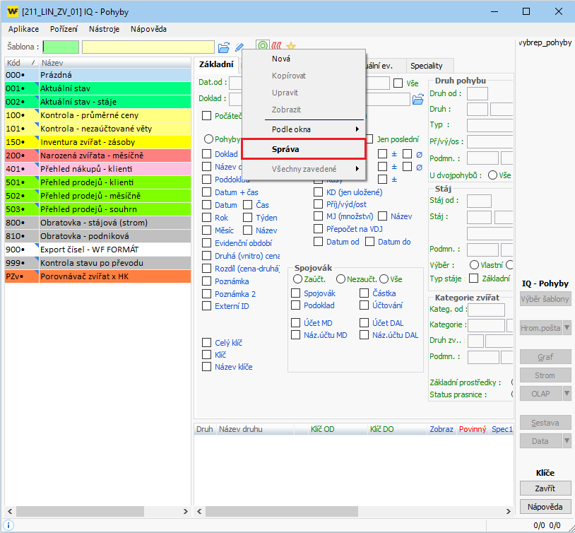 Jedná se o šablony pro efektivní využití, porovnání stavů, atp. Pro sestavu IQ Pohybů jsou to například Obratovky, Aktuální stavy zvířat, kontroly, Inventura, Přehledy prodejů, nákupů a další.