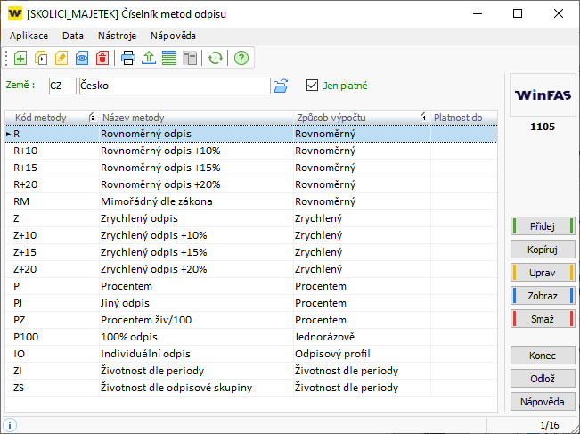Číselník obsahuje přehled metod odpisování, které můžete v rámci modulu Majetek využít (rovnoměrné, zrychlené, životností, procentuální atd.). Tento číselník není jednotný a není centrálně spravován, takže záleží pouze na vás, jaké metody bude obsahovat.