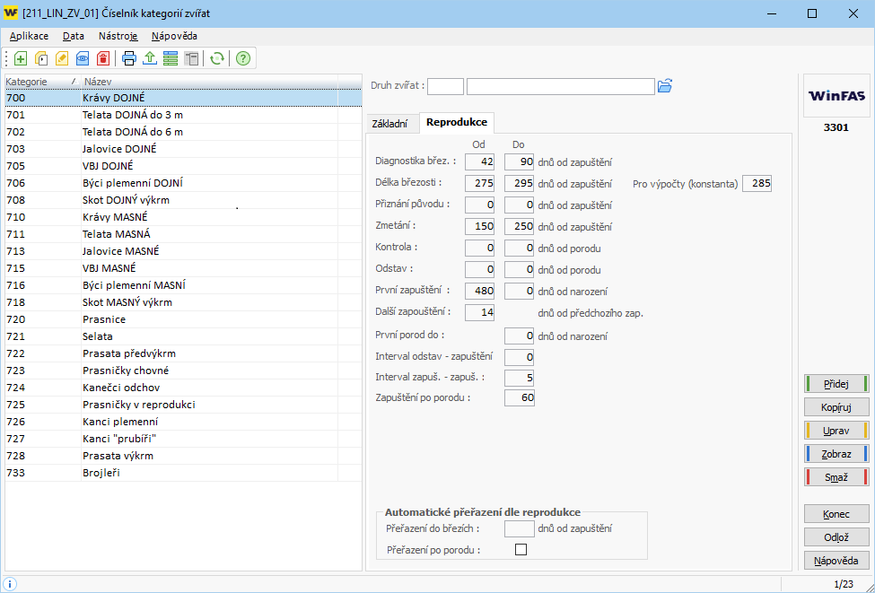 - Umístění: Nastavuje se mezi parametry na záložce Reprodukce v číselníku Kategorií zvířat *3301. Lhůta pro narození nebo mrtvé narození je určena parametrem "Délka březosti - od", lhůta pro zmetání je určena parametrem "Zmetání - od".