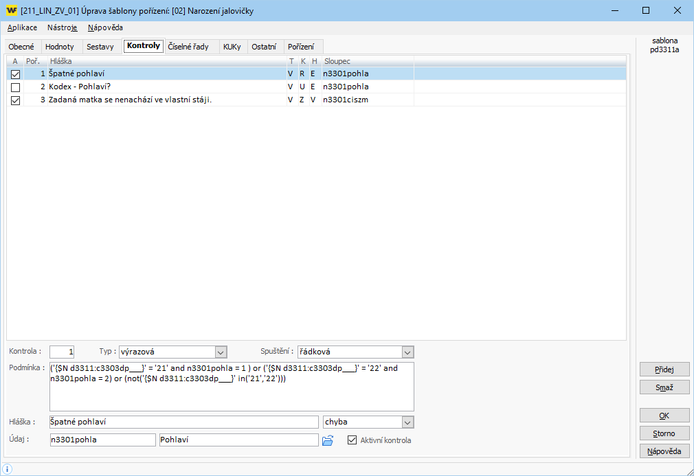 - Podmínka: ('{$N d3311:c3303dp___}' = '21' and n3301pohla = 1 ) or ('{$N d3311:c3303dp___}' = '22' and n3301pohla = 2) or (not('{$N d3311:c3303dp___}' in('21','22')))