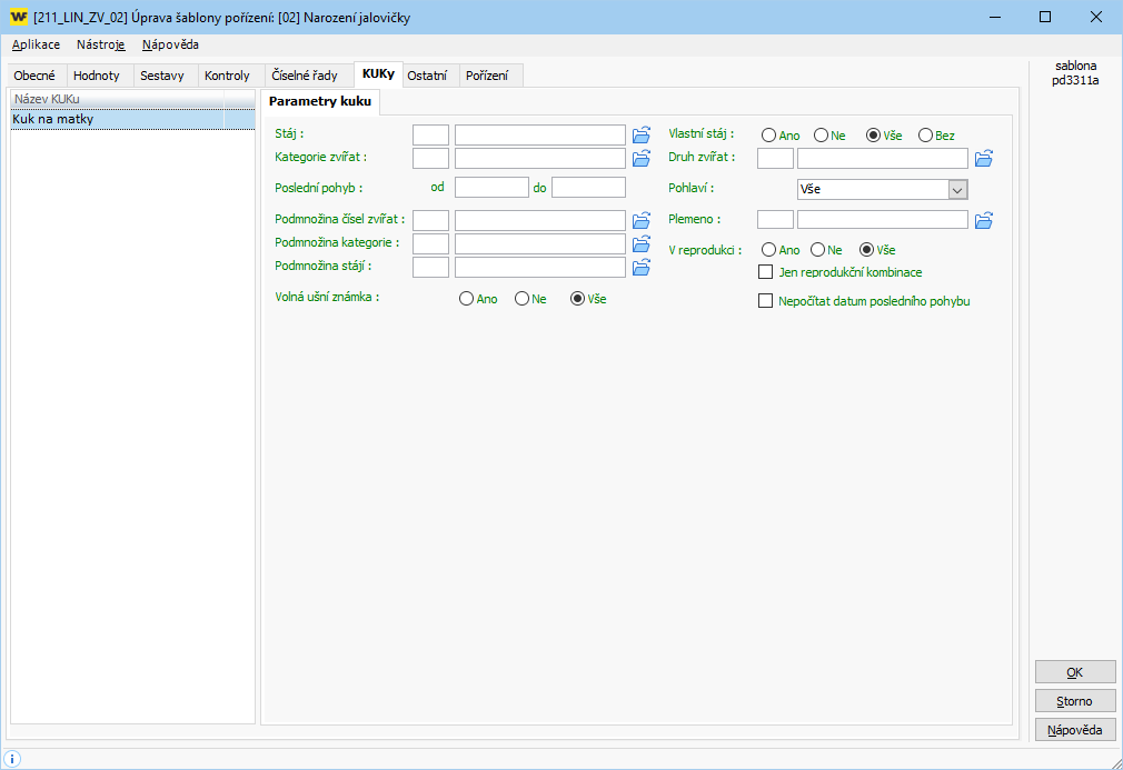 - Funkce: Kontroluje, zda je číslo matky obsaženo ve vybrané kategorii zvířat. Na záložce KUKy jsou zobrazeny další parametry pro zvolenou kontrolu.