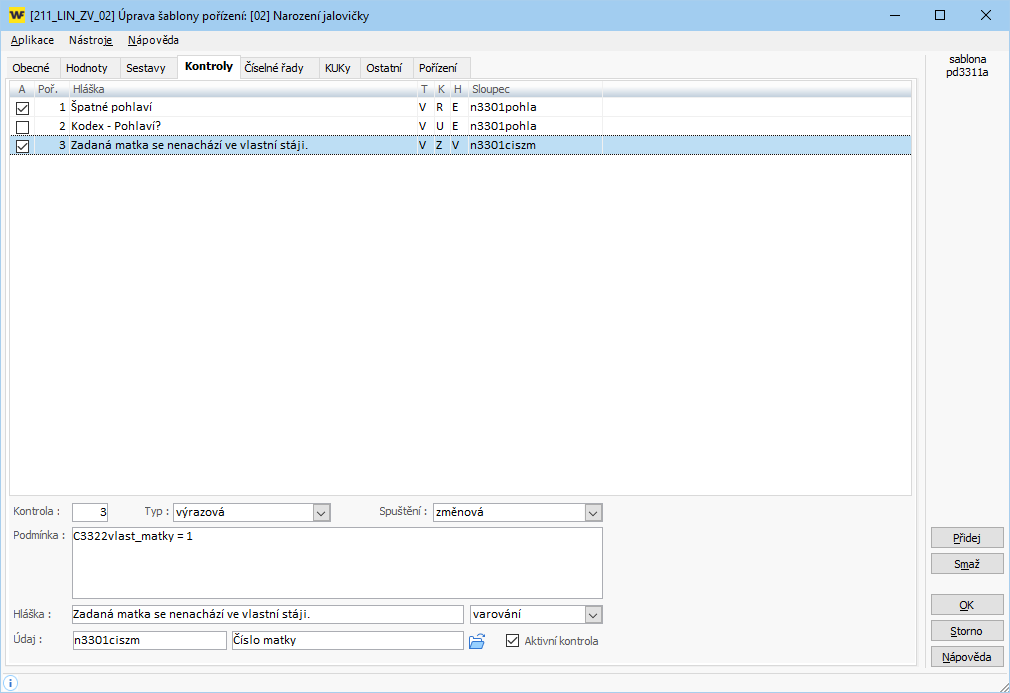 Pořízení pohybů umožňuje kontrolovat lhůty pro narození mladých zvířat, čísla matek a další. Jednotlivé kontroly, které je možné si v šablonách nastavit, jsou popsány níže.