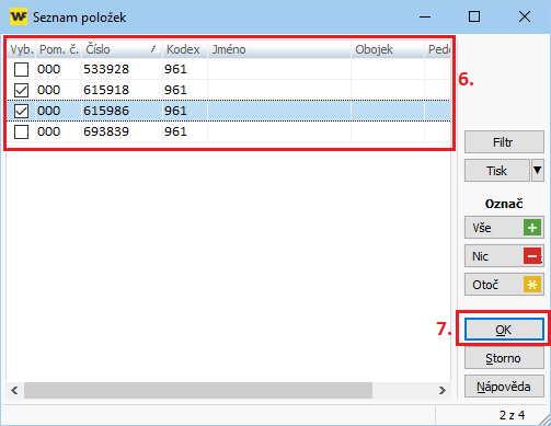 - 6. Pomocí zatržítka vyberte čísla pro hromadnou diagnostiku.