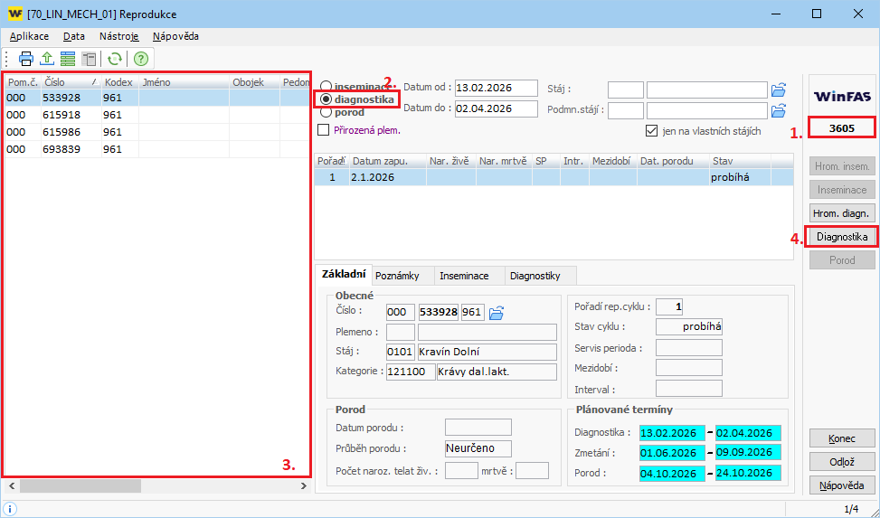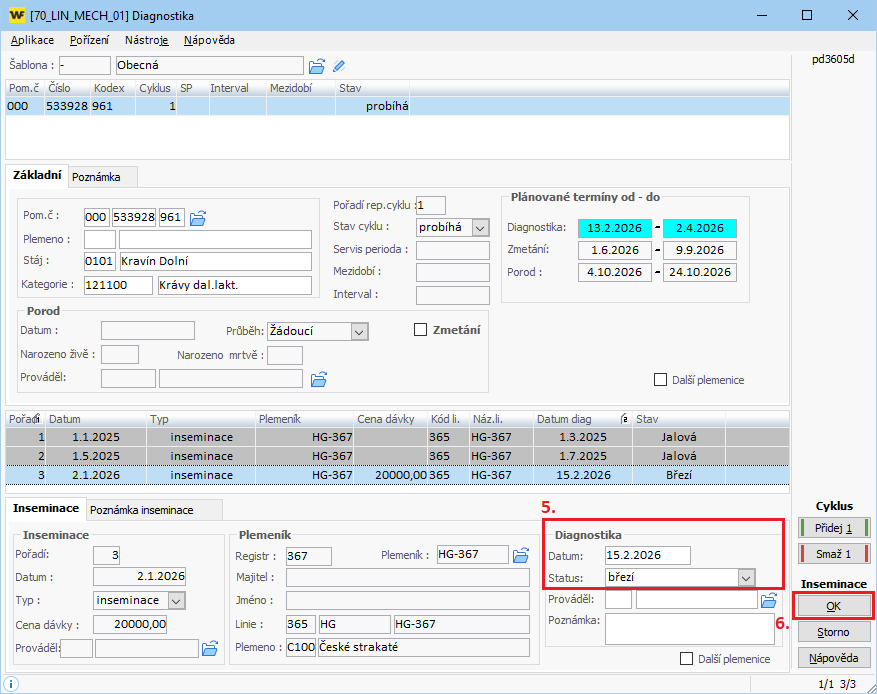 - 5. Zadejte datum diagnostiky a status (březí, jalová, ?).