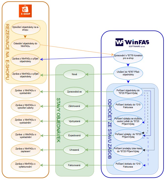 V moment, kdy objednávka má na straně WF stav „zpracovává se“, „expedovaná“ nebo „fakturovaná“ je o ni disponibilní množství poníženo a e-shop přebírá z WinFAS.