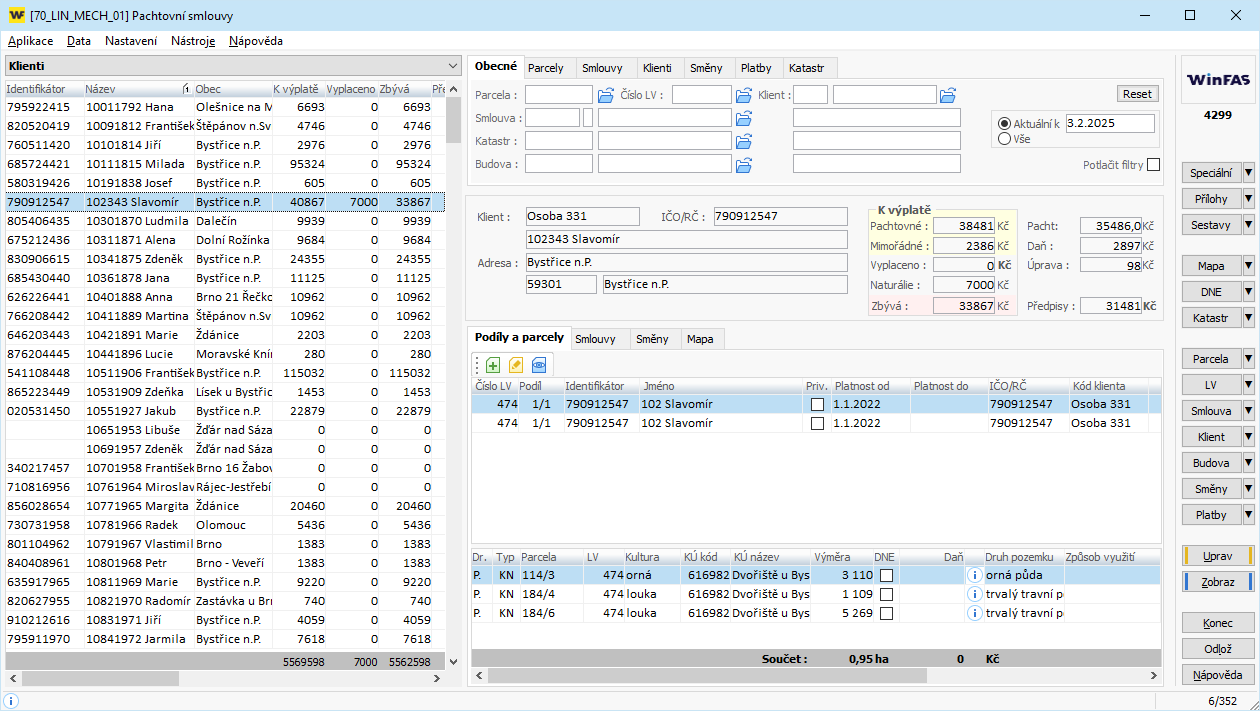 Režim slouží k náhledu na data pozemků od klienta. Základem je pohled na stav výplat, kdy jsou uživateli zobrazovány informace o částce k výplatě, vyplacené částce a zbývající částce k vyplacení jednotlivých klientů (propachtovatelů). Režim dále nabízí pohled na listy vlastnictví, smlouvy a směnné smlouvy klienta. Na mapě je možné si zobrazit parcely vybraného klienta.