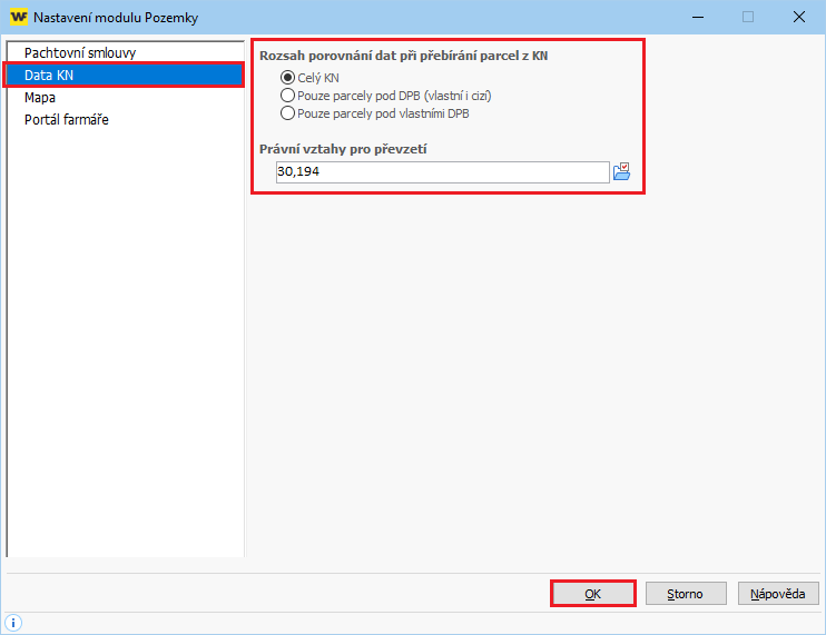 - Dle potřeby lze určit rozsah porovnání dat při přebírání parcel z KN.