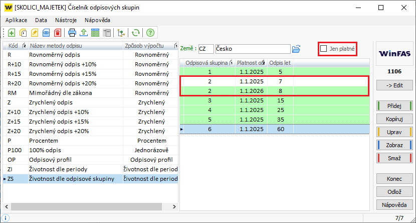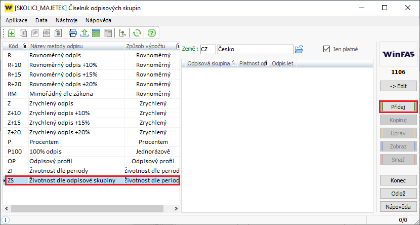 Dalším krokem je nastavení konkrétního počtu let odepisování příslušné odpisové skupiny. V aplikaci *1106 Číselník odpisových skupin vyberte nově pořízenou metodu odpisu a stiskněte tlačítko Přidej.