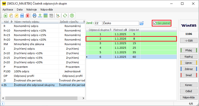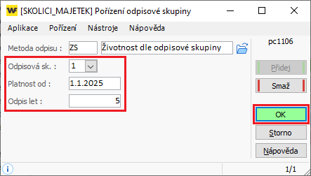 Názledně z nabídky vyberte požadovanou odpisovou skupinu, zadejte datum platnosti, počet let odepisování a potvrďte tlačítkem OK.
