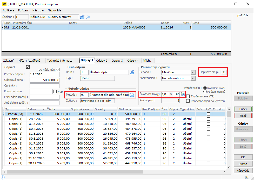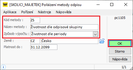 V aplikaci *1198 Evidence majetku stačí mít nastavenou příslušnou metodu opisu v šabloně (případně doplnit metodu ručně), po zadání klasifikace majetku se automatiky převezme životnost z číselníku a dle parametrů se spočítá odpis. Pokud máte v číselníku nastavenou platnost, systém dle data počátku odepisování převezme z číselníku příslušnou hodnotu.