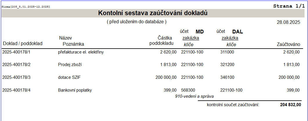 - Zobrazí se Vám kontrolní sestava všech zaúčtovaných dokladů včetně zaklíčování.