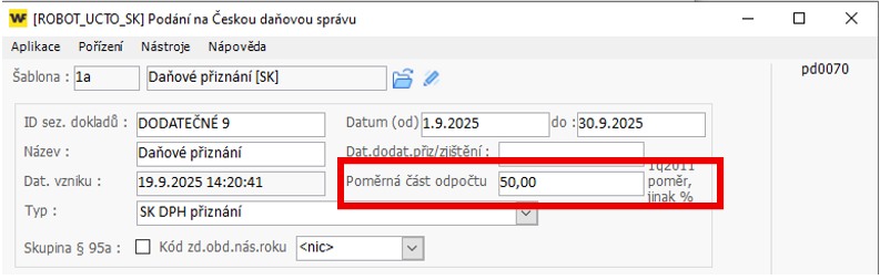 - Výše krácení je přednastaven v šabloně 1a – Daňové přiznání [SK] v poli Poměrná část odpočtu