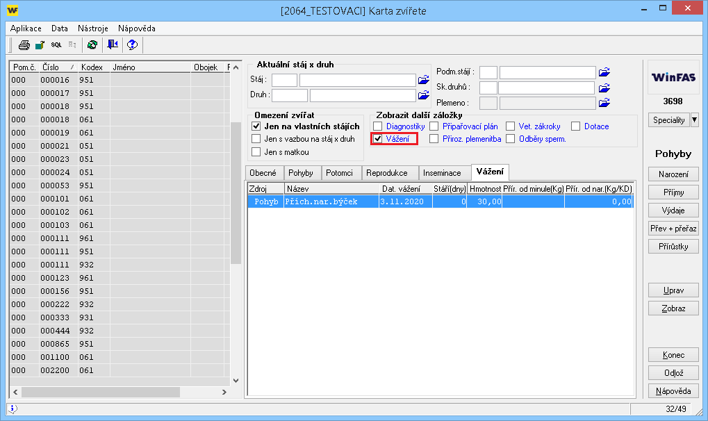 Pro zobrazení záložky s daty o vážení zvířat je třeba v aplikaci zaškrtnout pole Vážení. V záložce se zobrazují data z vážení, pohybů (průměrná váha) a případně „tabulková“ pokud zvíře nemá evidovaný porod v evidenci. Data jsou dle původu (zdroje) barevně rozlišeny.