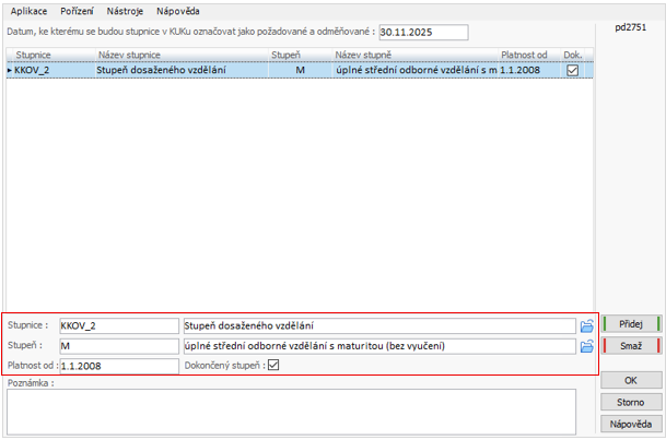 - Platnost od: lze ponechat datum nástupu, v případě změny vzdělání dalším řádekm pořiďte nový stupeň s platnosti, kdy změna nastala