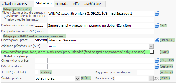 Pokud nastavení úvazku nedpovídá skutečnosti, např. zaměstnanci pracující příležistostně DPČ/DPP, kromě hodin v úvazku provedete nastavení na záložce Statistika, údaj Nerovnoměrná prac. doba ....