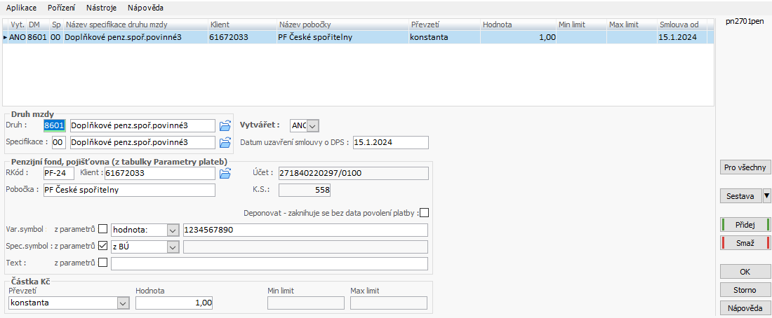 Dále je nutné u zam-ce zadat vlastní automatickou větu pro Penzijní připojištění firma s konkrétními platebními údaji (var.symbol) pro tento nový druh 8601 (8611). Buď v *7011 pod tlačítkem Aut.věty, nebo v *7039 Automatické věty jednotlivé). Protože se částka tvoří dle zákona (nyní ve výši 4 % základu soc.pojištění), uveďte do částky libovolnou hodnotu, např 1 Kč.