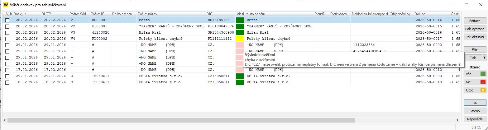- Při fakturaci s tímto nastavením se poté v okně pro výběr DL k zahlavičkování navíc zobrazí sloupce s informací o výsledku ověření přes VIS