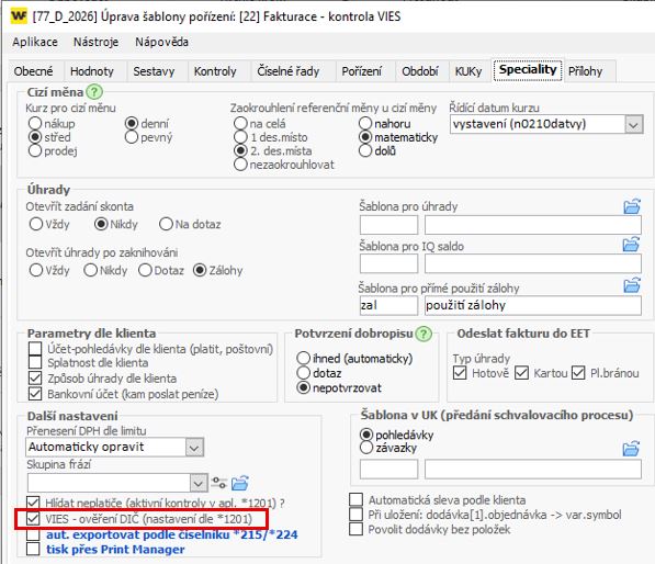 - Na záložce Speciality jde o status "VIES - ověření DIČ (nastavení dle *1201)" - jeho zaktivněním automaticky zapnete funkci dle nastavení v *1201 Zdroje kreditních informací