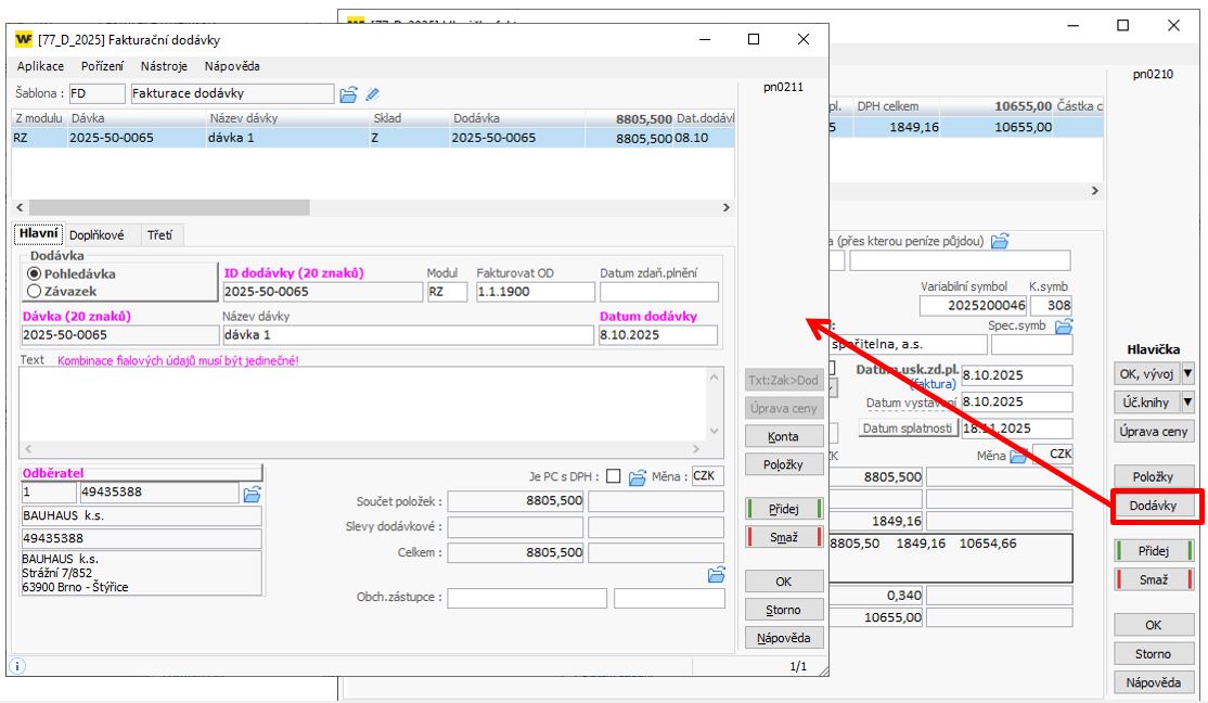 - Tato varianta je vhodná i pro fakturaci více DL současně (poté vznikne i stejný počet dodávek)
